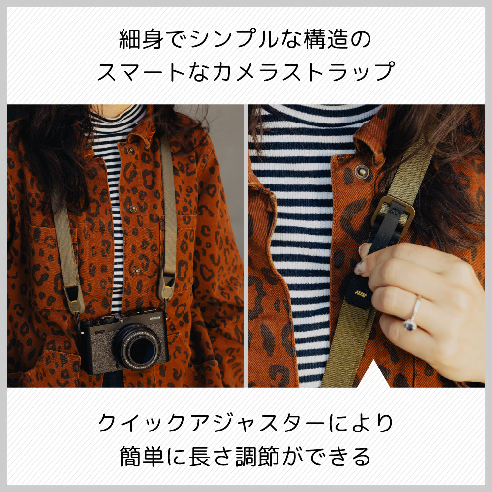 アルミニウムとハイパロン製のクイックアジャスターにより、指1本で長さ調節ができるスマートなストラップです。